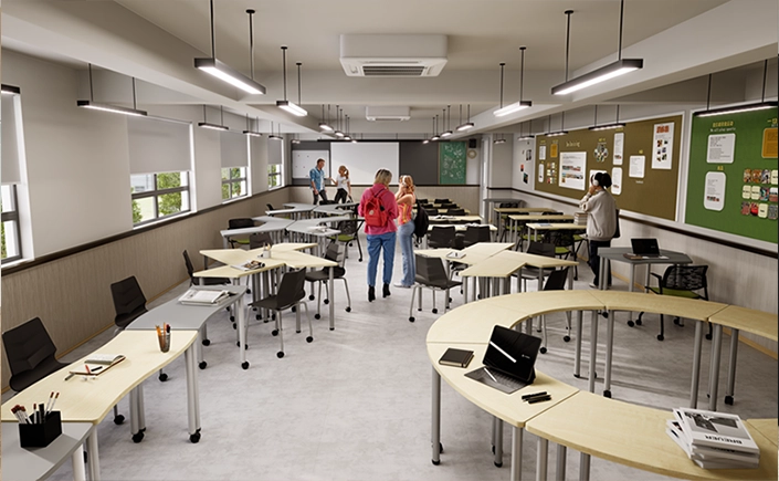 Modern education increasingly emphasizes interaction, collaboration, and problem solving. Students work in teams, discuss ideas, move between activities, and engage with both digital and physical tools throughout the day.