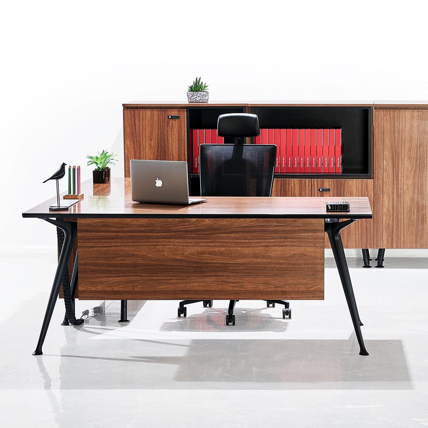 Enrich has a sleek under structure and deeply integrates art & practicability. The side cabinets deftly includes opening door cabinets, which can satisfy varied private storage demands. It’s just a turn-back to switch between private space and an office space.